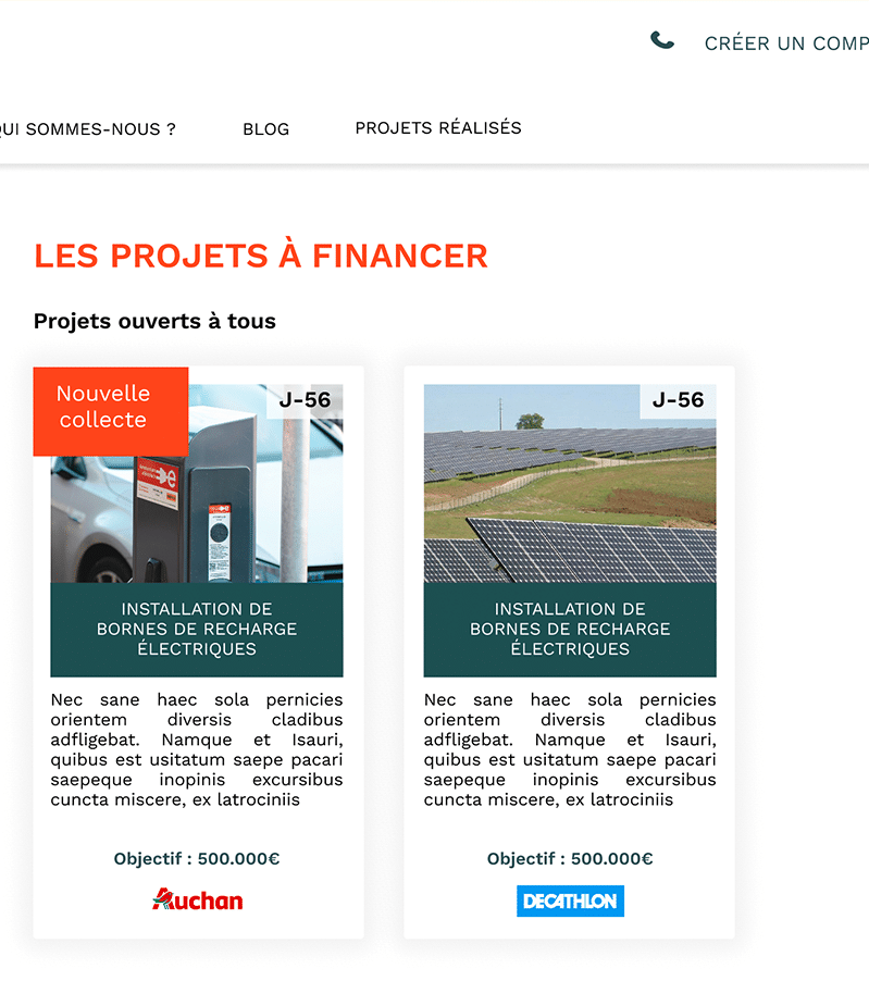 Contexte : Création d’une plateforme d’investissement durable pour les particuliers clients des chaînes du groupe Mulliez, pour leur  permettre d’investir une partie de leur épargne cumulée – via les programmes fidélités – dans des projets durables. La plateforme n’a jamais été mise en ligne.